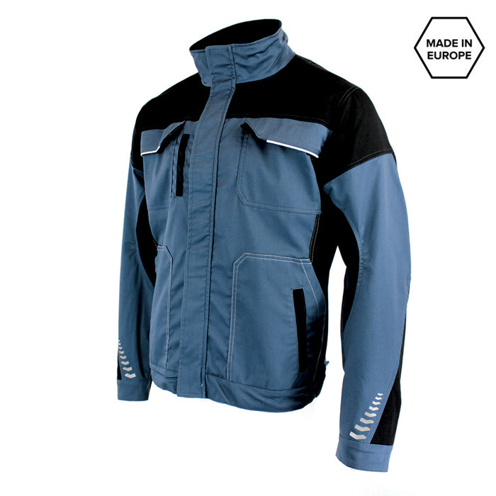 Work jacket PACIFIC FLEX is a work jacket with perfectly fitting cut. It has standing collar. Opening zipper, anatomically shaped sleeves, 7 functional pockets with CORDURA reinforcement. Printed reflective elements. Slimmer, ergonomic fit.;